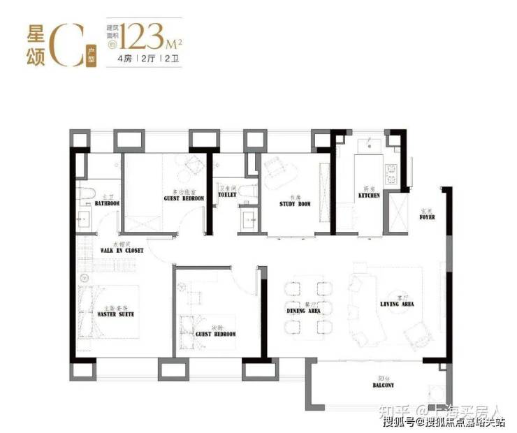 建面约123-129㎡真四房,这个户型的南向面宽和尺度感堪比一般的别墅。另外,四房+六飘窗+宽面阳台的设计,让整个空间更具延展性。