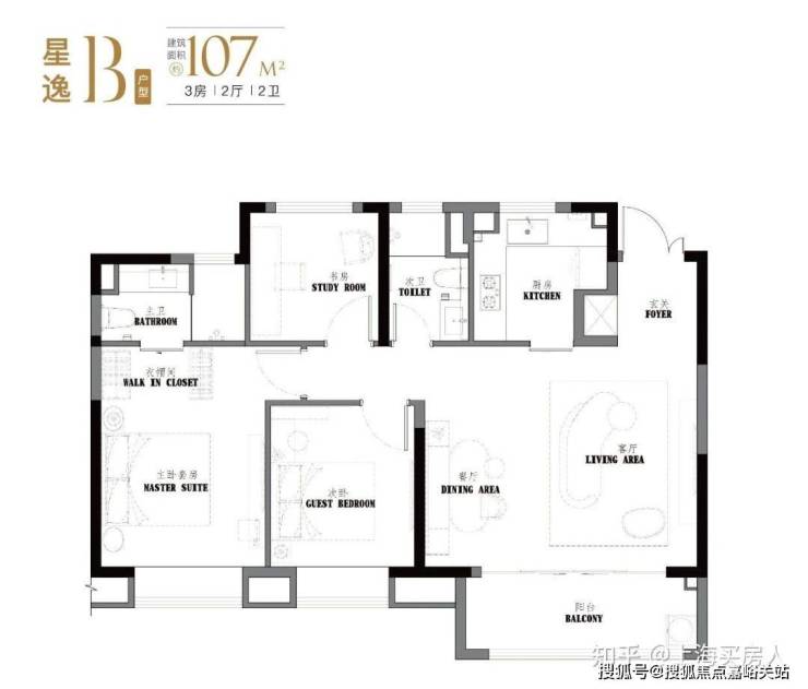 户型图项目约103-107㎡3房2卫设计,有着宽绰的大横厅设计,并且3.5开间朝南。相比传统户型来说,星尚·观澜世嘉约103-107㎡户型的整体南向采光、视野等维度的表现,更加出色。