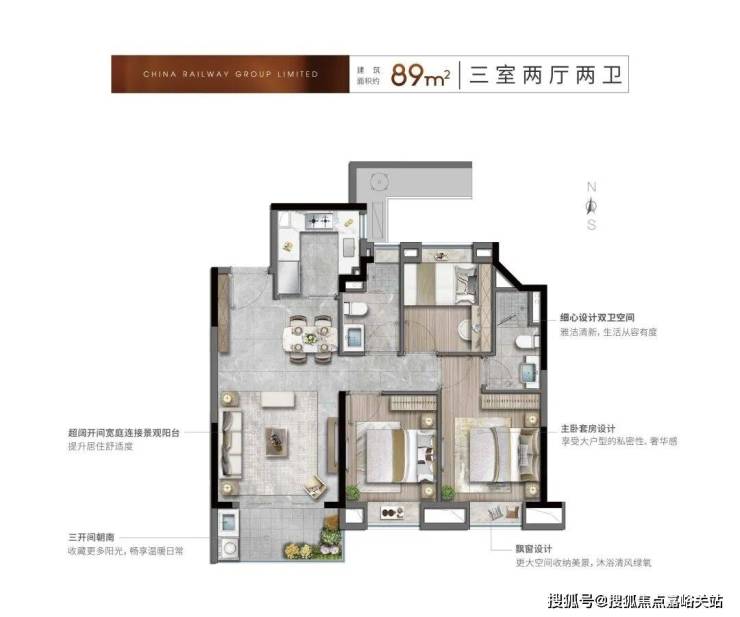 89㎡三房两厅两卫户型,堪称临港刚需市场的“效率标杆”。在有限面积内实现三房两卫格局,且北向房间面宽与进深达黄金比例,功能性拉满让200万左右预算,也能在临港主城拥有功能完备的宜居之家。