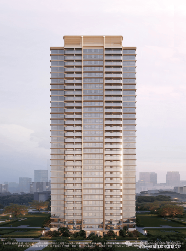 建筑方面,海上·清和玺采用独特的香槟金色格栅塔冠及壁柱,以香槟金与白色调搭配,形成“金镶玉”的立面造型,充分以“玺系”的品质结合在地文化海派以及人群品质需求。大面积的玻璃与精致的层间金属飘板相结合,营造出公建化的立面视觉效果,既保证了通透性,温润雅致且历久弥新。