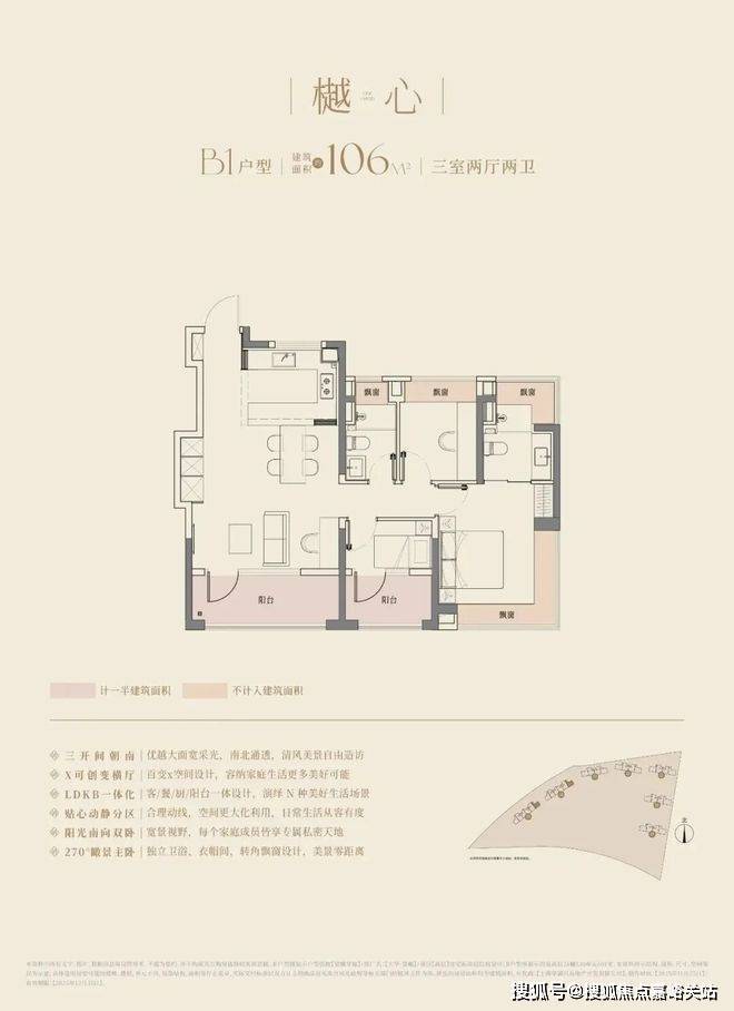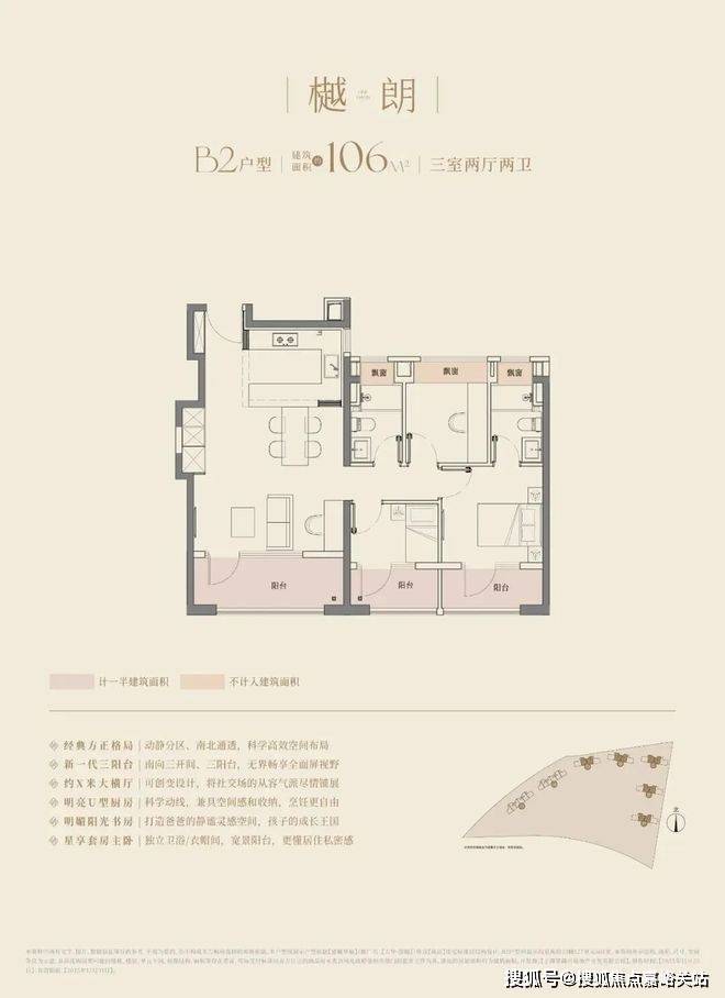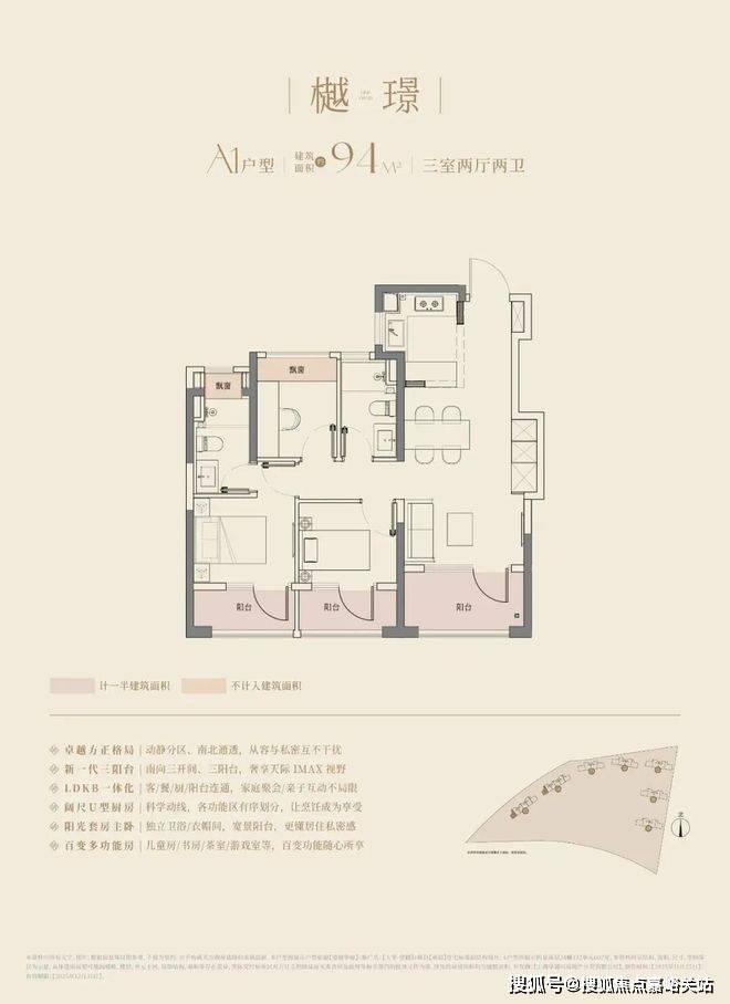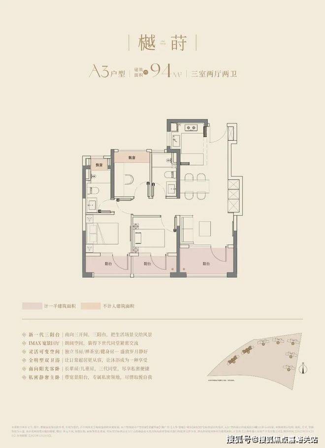 大华望樾的高层建面约94㎡户型做到了三阳台的配置;
