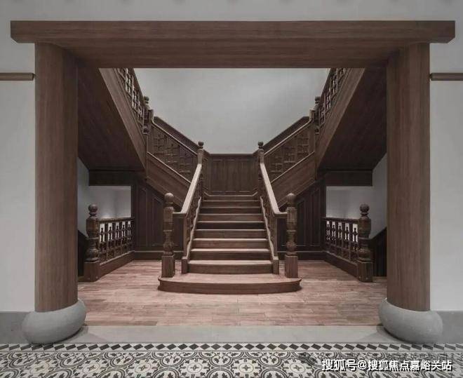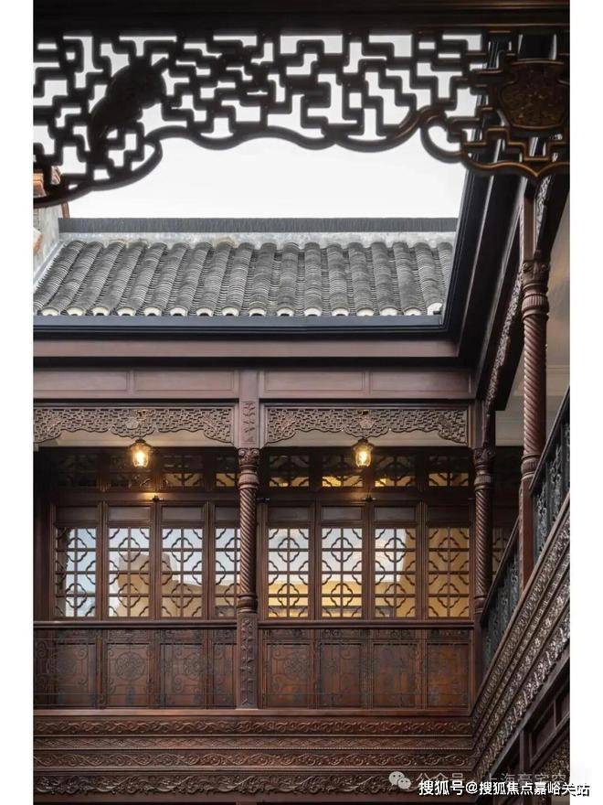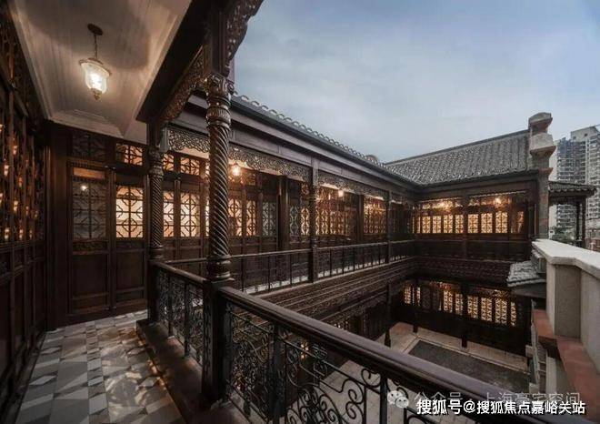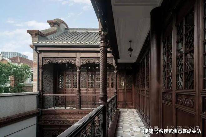 沿街面当中的入口是高大的砖雕门楼,两侧是对称的西式山花,两侧的二楼临街各挑出的八边形晒台。推门进去是一处天井,浅浅的天井有三开间宽,二层为一圈阳台,西式的扭纹柱、铸铁栏杆搭配中式格栅木雕,透露出对生活风情的精雕细作。