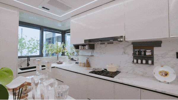 整体动静分区格局。在U型厨房基础上融入 “社交属性”,让烹饪时亦可与客厅家人互动。