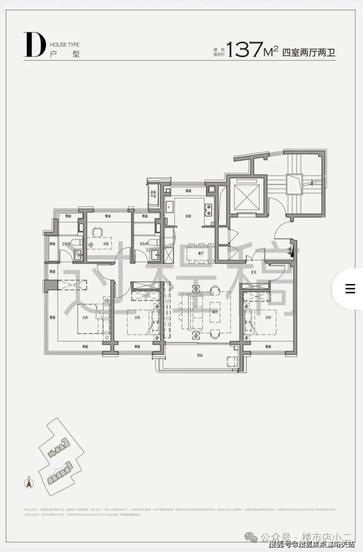建面约137㎡的4房户型,在同等面积下实现了更精巧的功能布局,标配入户玄关,客餐厅、厨房、阳台一线贯通,家政间,通透感十足270°全景舱设计是项目一大亮点,部分户型通过北/南/西三向展开近36米连续玻璃幕墙