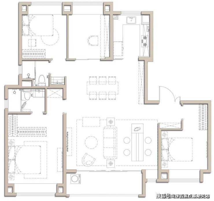 大横厅的设计,让这个户型拥有堪比别墅的南向采光面, 这个尺度感以及采光通透度非常出众。