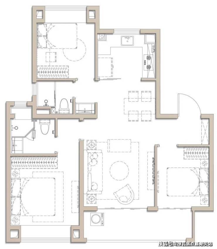 细节方面,入户玄关+主卧套房+客卫干湿分离,这个户型几乎做到了一个好户型应该有的所有。