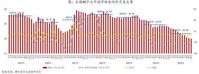 麟评居住大数据研究院近日发布的报告显示,2025年10月全国40个大中城市租金挂牌均价为34.01元/㎡/月,环比下跌0.08%,同比下跌2.49%,环比跌幅较上月收窄0.14个百分点。