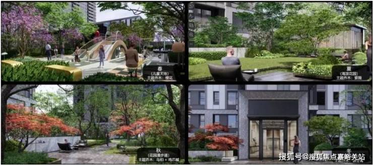 多花园: 沿归家轴线设计了悠闲童梦花园·、静谧私语花园、精致乐享花园、邻里会客花园、活力健身花园等。花园种植了像金桂、红梅、晚樱、榔榆等植被,常绿与落叶植物组合搭配,三季有花,四季有景。