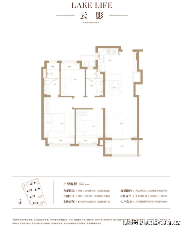 建面约96㎡3房2卫户型,三开间朝南,全卧室带飘窗。户型的采光、视野非常出众。主卧套房设计,保证私密空间。S型的分户墙,褪去呆板,为家具预留更多的空间;经典的餐厨客厅一体的大客厅,作为“家庭厅”使用,可作为亲子游戏、娱乐健身等空间。