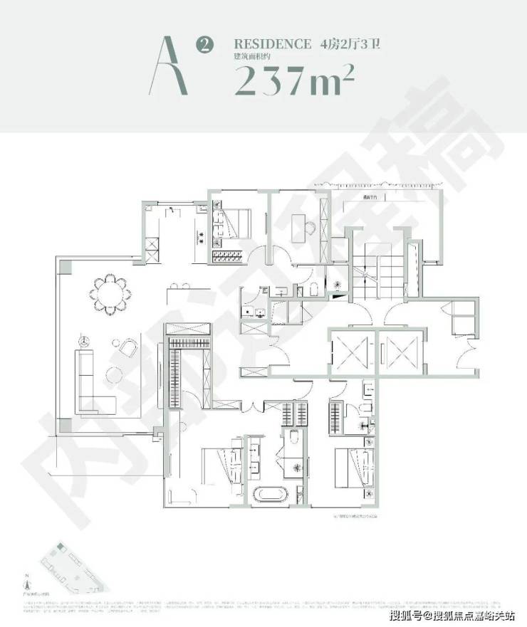 该户型是经典的四叶草布局,四开间分布在四角,兼顾私密与互动,是二胎家庭的优选;