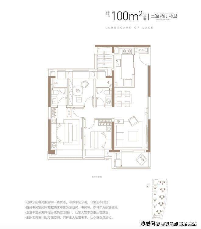 三开间朝南+主卧套房设计+动静分离+全卧室带飘窗,功能性和尺度感完美结合的3房,能满足业主从二人世界到三口之家,再到二胎家庭的全生命周期需求。