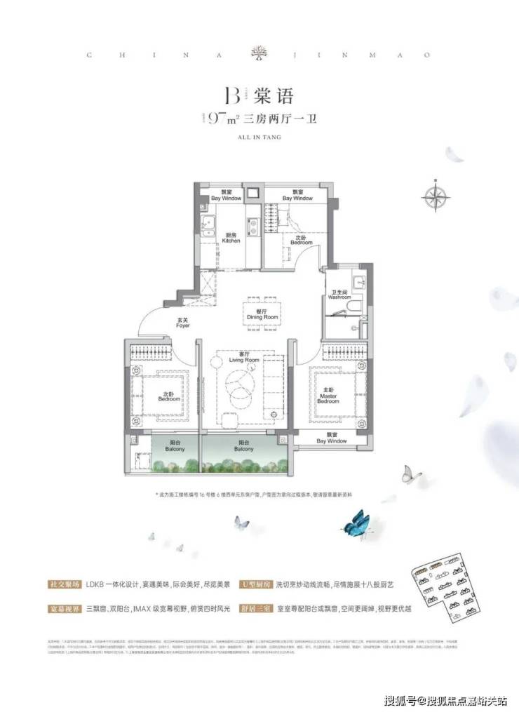 建面约97㎡3房2厅1卫,户型三开间朝南、再加上“3个飘窗+双面阳台系统”,不管是采光、视野、通风、私密性,还是实用性都十分出色。