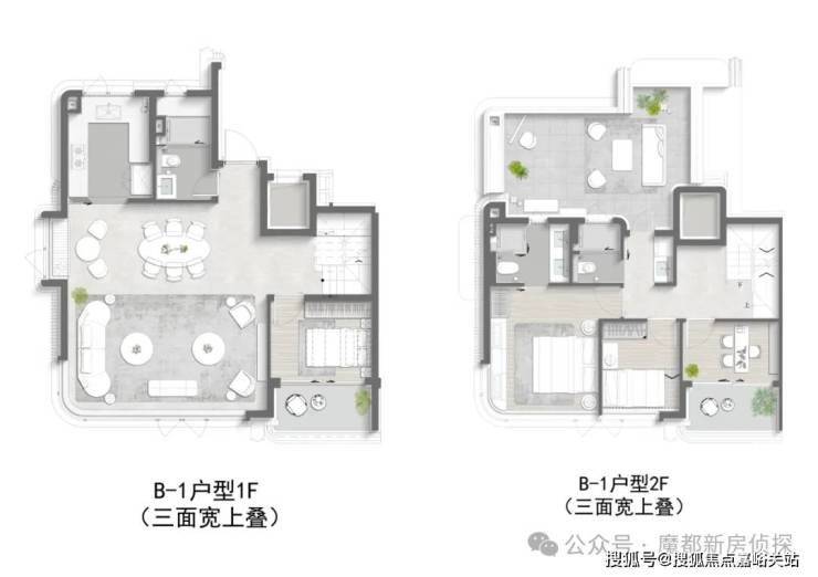 再来说项目的叠墅产品:约9.5米南向三面宽、独门独户、约6.1米地下室挑高 (下叠) 、超大露台 (上叠) ,可以说,将墅居的尺度感和扩展空间拉满!