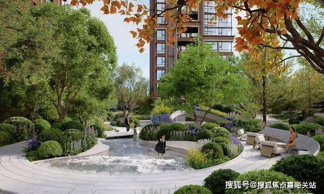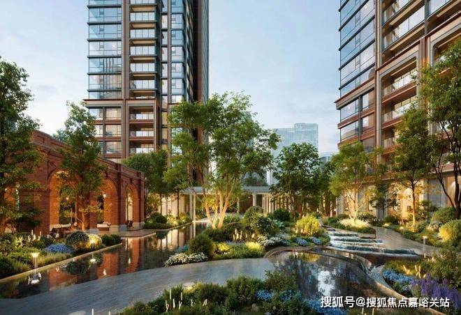 社区景观上,突破市区项目常见的「兵列树阵式」布局,通过建筑楼体的精密偏转,形成罕见的围合式社区形态。