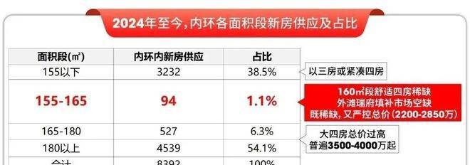 而在总价层面,外滩瑞府也是当下千载难逢的2200-2850万一步到位4房的机会。2024年至今,内环的四房供应起步面积段大约在180㎡,180㎡以上的四房供应占比55%,总价高昂,普遍在3500-4000万左右。