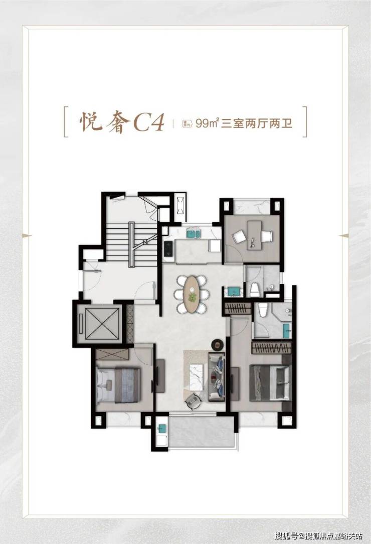 再比如C6悦尊户型,建面约96㎡3房2厅2卫,比C4悦奢户型少3㎡,总价也适当降低。C4户型该有的优点,也全都有,比如:
