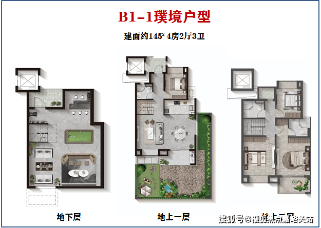 面积上与B1-1户型相同,建面约145㎡,功能区也大致相似。
