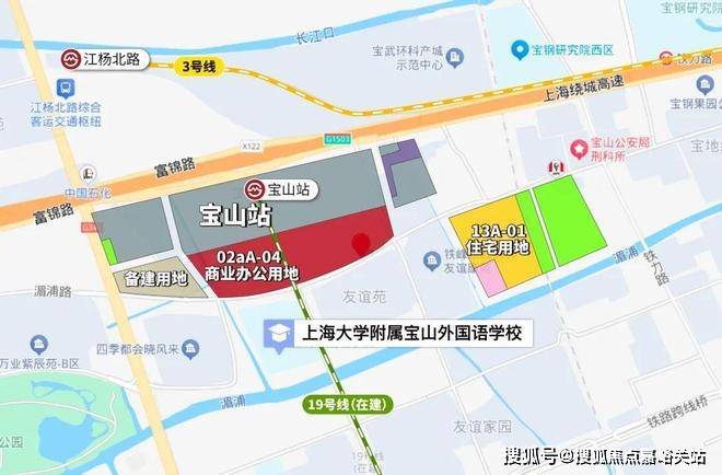 项目地处宝山杨行板块,是19号线宝山站(在建)TOD综合体地块。地块用途为商业、住宅、办公、餐饮旅馆混合,其中13A-01为住宅,容积率2.3,装修标准2500元/㎡。