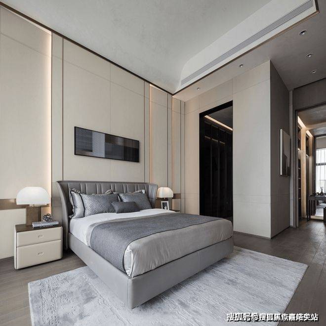 通过走道和客厅,客卧在房屋的另一端。墙面层叠的造型令人耳目一新,与主卧立面遥相应和,独立的卫生间与衣帽间为客卧的不同使用者提供了贴心的私人起居。