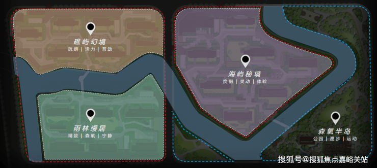 罕见双自然水系!一横一纵2条水系将项目地块一分为三,形成三座天然“岛屿社区”,这在市面上非常少见。