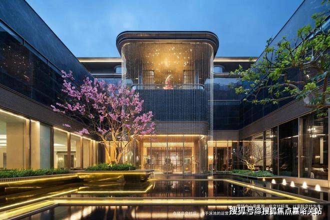 下沉式环幕庭院,跌水景观环绕,池底仿黑金砂与宝石晶片闪烁,点缀百余灯珠,师法“琉璃水光” 形意,糅合视听五感,打造全浸式立体园境,天工巧夺,嘉定未见。