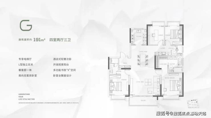 约7.7M奢阔宽客厅及南向瞰景阳台;三开间朝南,纵向双厅兼顾采光和通风,
