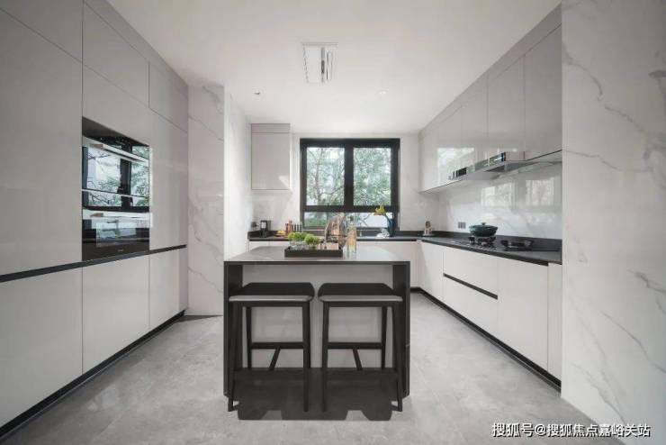 中西厨设计,功能性更强,U型操作台搭配大面积开窗;