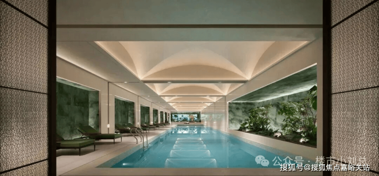 “植物园泳池”把绿植与水体共置,墙面采用皮革面“绿野仙踪”石材,营造出带度假调性的公共空间。
