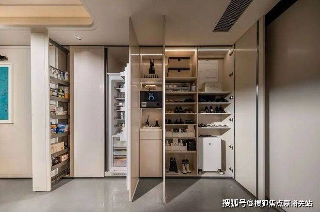 进门整面墙打造了玄关柜+“S”墙+零食柜设计,搭配烤漆板饰面,实用性与质感满分!
