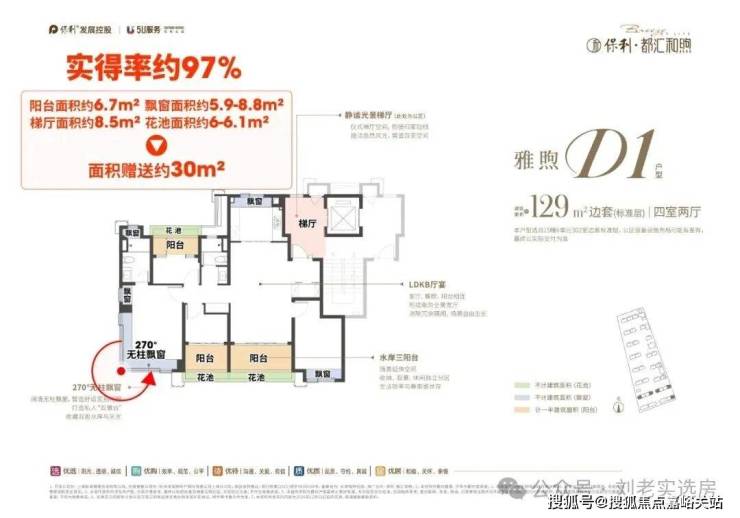 洋房标准层边套 赠送面积约30㎡,实得率高达97%,相当于直接赠送约 200多万价值,常规项目80%的实得率与之相比差距明显, 该户型实际可享受常规155-160㎡的空间尺度。