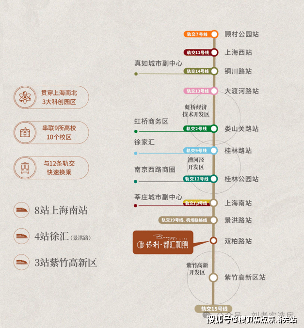 3站紫竹、4站徐汇,可换乘1号线通往徐家汇、新天地 ;未来19号线建成后,在景洪路站换乘可 4站前滩、6站后滩 ,直达陆家嘴等CAZ核心。