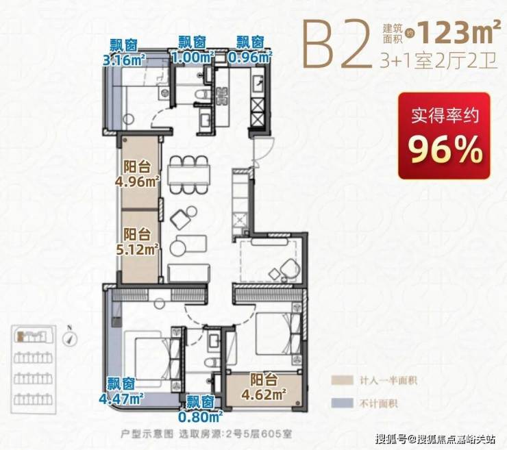 3阳台+5飘窗,合计赠送面积约17.7㎡,实得率更是惊人地达到了约96%(2号楼05室)。