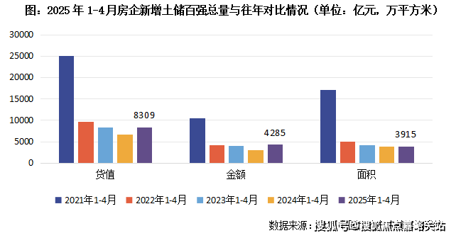 2025年1-4月份,新增土储百强房企的新增货值、总价和建面之和分别为8309亿元,4285亿元和3915万平方米,货值同比增长23.6%,投资金额同比增长41.5%,金额增幅显著缘于核心城市核心地块供应量明显提升,建面同比增长3.2%。投资百强总量三个指标均同比正增长,企业投资积极性筑底回升。