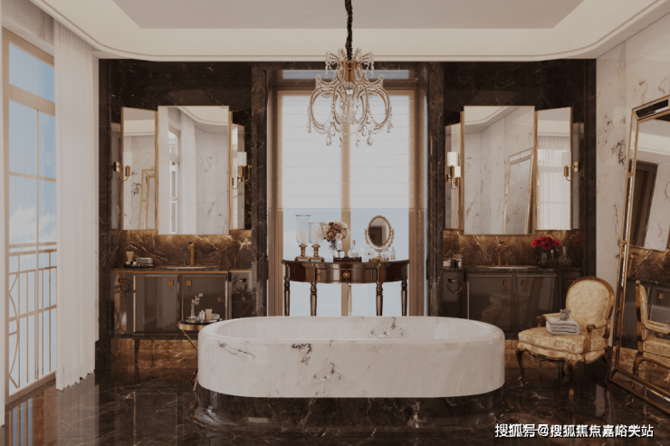 秩序,是主卫浴空间布局的重点。两个独立台盆相对而立,分属男女主人,营造出从容自如的使用体验。大面积运用黑白撞色大理石,让空间的秩序美与材质的自然美融合,颇具观赏韵味。