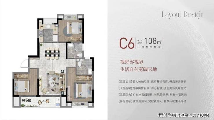 建面约108㎡3房2厅2卫,做到了 三开间朝南+双阳台设计+主卧套房设计+南北通透 ,该户型得房率非常高。