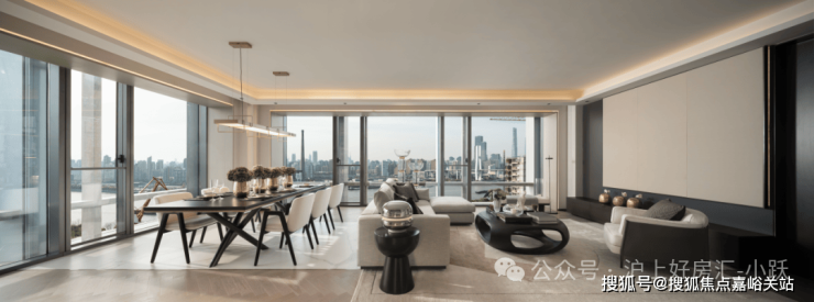 首层|家庭聚场:大开间横厅设计,全景落地窗,将阳光与园林景致最大化引入室内,实现“客厅-餐厅-花园”的无缝衔接,10人位沙发与8人宴客圆桌从容摆放,无需刻意规划便显大家宅邸的社交格局,无论是日常家庭欢聚,还是圈层宴请,都能尽显大宅气度。