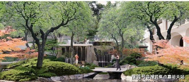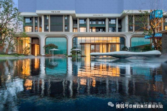 浮光池院水院会客厅,现已实景呈现,水景中央的艺术小品,如一滴水在湖面晕开,泛起阵阵涟漪。