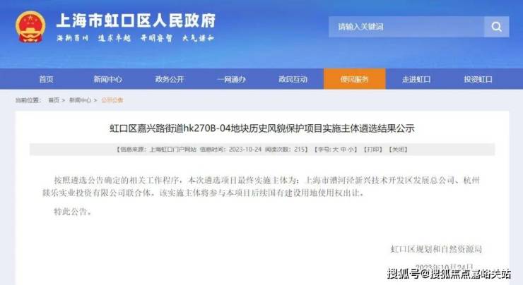 虹口区嘉兴路街道hk270B-04地块历史风貌保护项目实施主体遴选结果公示,终确定由上海市漕河泾新兴技术开发区发展总公司(临港集团)及杭州燚乐实业投资有限公司(越秀)联合开发。