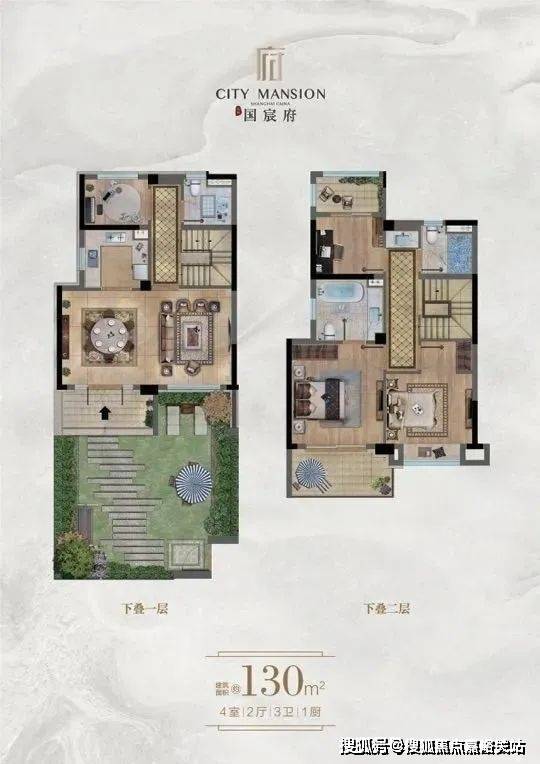 下叠:1-2层130平,有花园和地下室