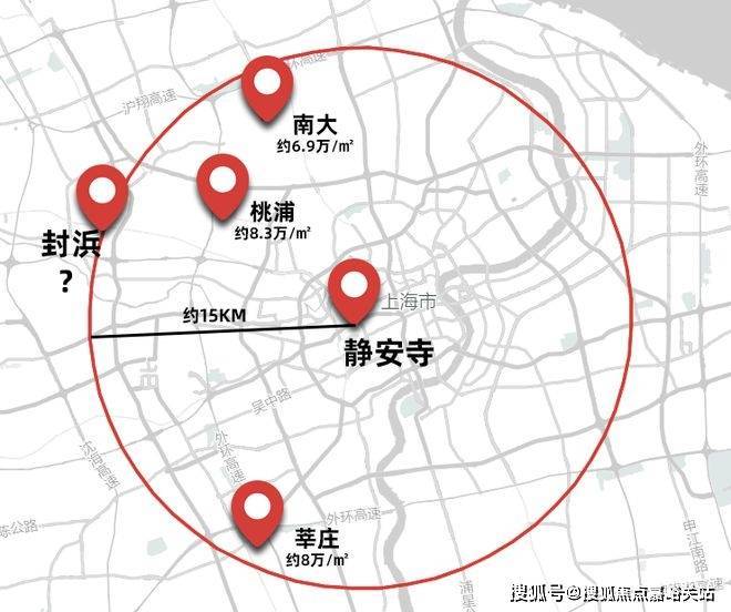 既然是一部地铁直达静安寺,那我们就以静安寺为圆心,直线约15km为半径画圆,可以看到,圆内除了封浜之外,还覆盖有桃浦、南大、莘庄和徐泾等众多热门置业板。
