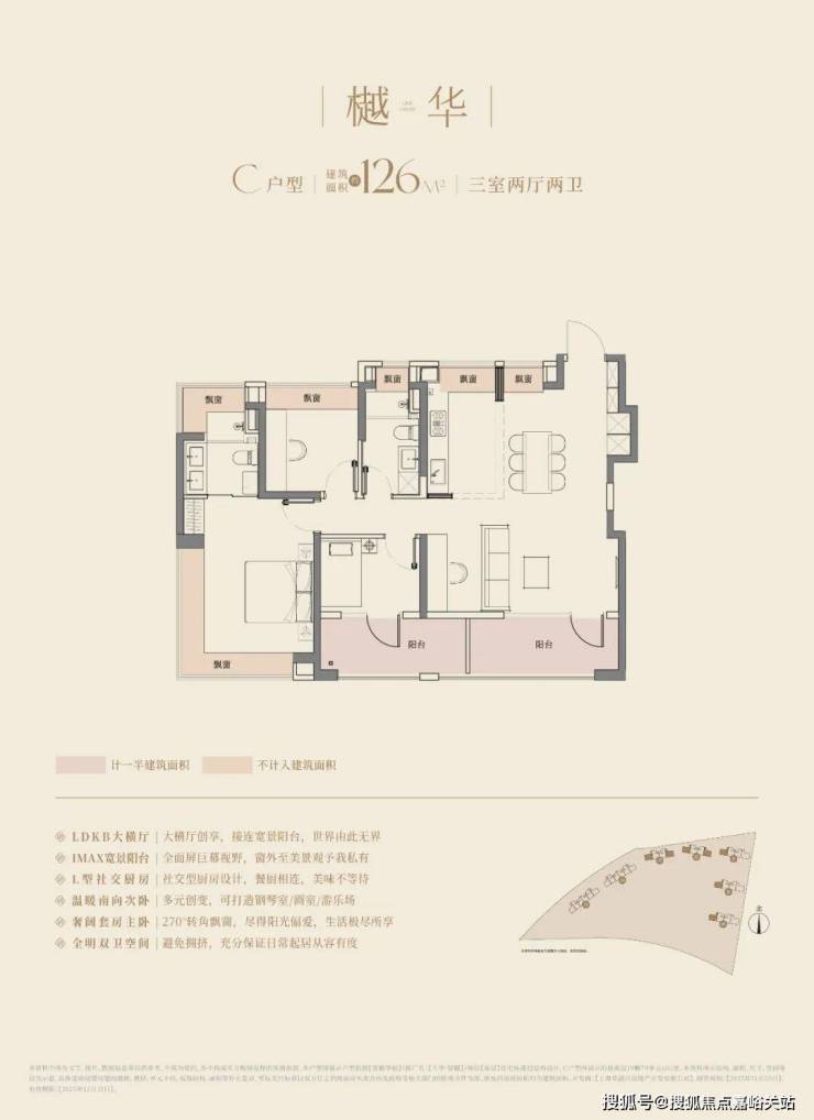 经典动静分离户型,预留分户“S”墙设计,三开间朝南+双阳台,阳台合仅计算一半建筑面积,主卧以及主卫附赠270°转角飘窗;