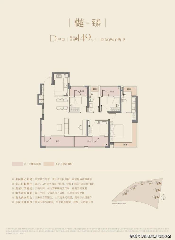 经典动静分离户型,4.5开间朝南+南北四阳台,阳合仅计算一半建筑面积,主卧以及主卫附赠270°转角飘窗;