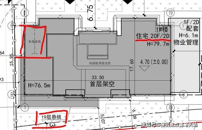 该方案亮点颇多,总计八幢高层和小高层设计,最南端的1#和2#楼均设置有私家泳池,而且还在19F采用了住宅楼当中较为少见的悬挑工艺,延伸出了一定的使用空间,个人预估这两幢会是配置大平层豪宅产品。