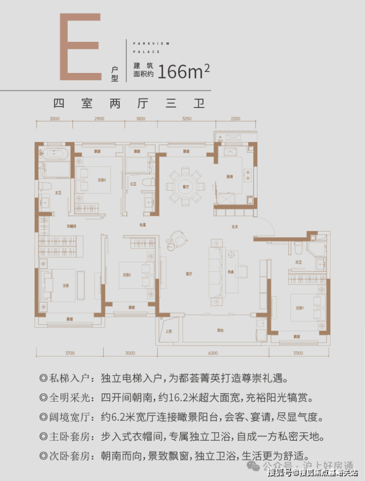建面约166㎡奢境户型,南向四开间面宽可达约16.2m,约6.2米宽厅连接宽幕阳台,突破性尺度设计,带来通透的全景视野,一眼望向城市自然与繁华,居住于此,大平层的尊崇奢居体验油然而生。