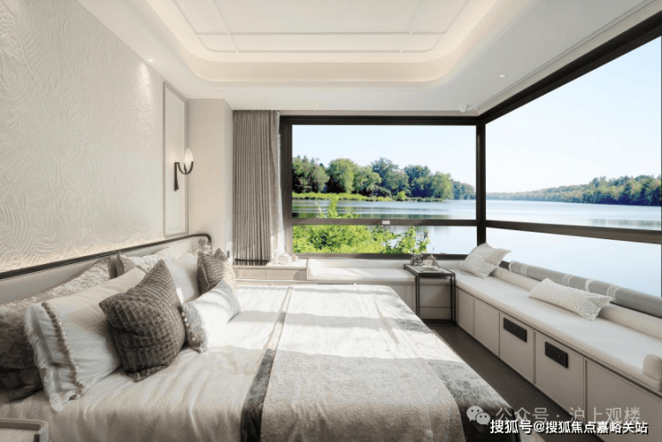 约 270°转角飘窗,把不同角度的阳光和风景都框进来,阳光洒满整个窗台,外面的景色一年四季都在变,每天看到的画面都不一样,特别有生命力。