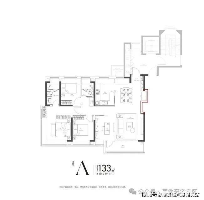 户型设计:精研 “全龄化家庭需求”,打造约 82% 得房率的全明户型,建面约 118㎡三房两厅两卫户型实现三开间朝南,约 6.5 米宽幕阳台引景入室