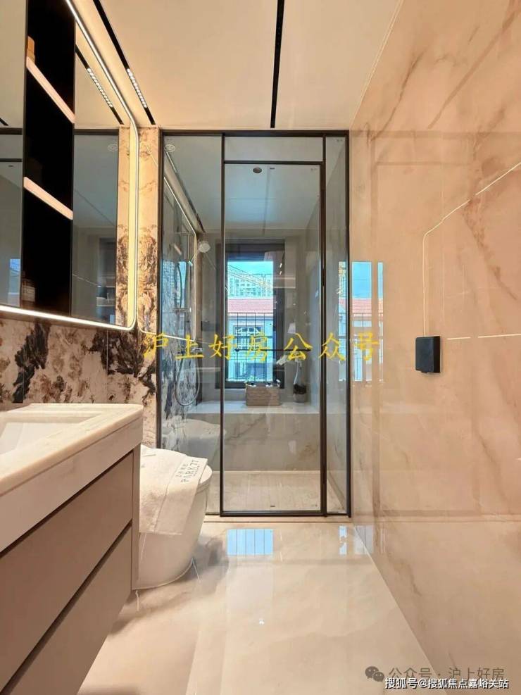 A户型连主卫都配270°转角飘窗,西侧直面杨浦内环新貌,西南侧远眺三件套,城景与生活无缝衔接。