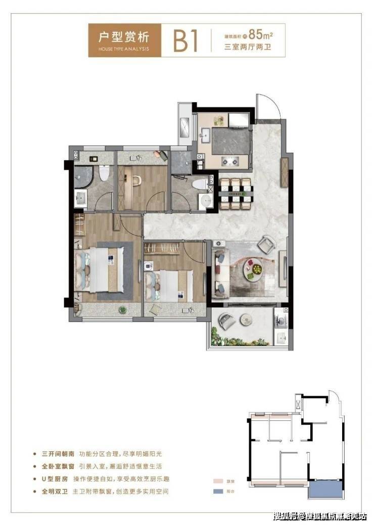 市面上绝大部分80+㎡户型做到三房已是极致,但 项目建面约85㎡户型不仅实现3房功能性一步到位,甚至做到了2卫,舒适度和私密性更上一层楼!