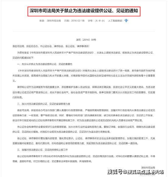 比如深圳禁止小产权房交易方面,2016年就发布《关于严禁为违法建筑销售行为提供公证和律师见证服务通知》的通知,明确要求各区司法局、新区综合办,市公证协会、律师协会,各公证处、律师事务所禁止为违法建设提供公证、见证。