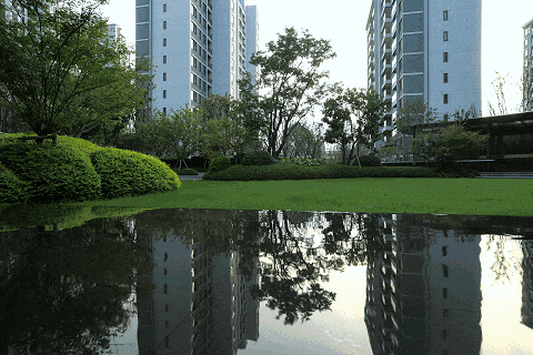 社区中央,规划了一处经典的“蓝宝石”水景,长约28米的中央景观水池,以清澈莹润的镜面水质,倒映着镜花水月的奇妙意境。紧邻水池还设置了林下看护坐阶邀请着人们随时开启一场慵懒的水岸冥想,这不仅是一方可供观赏的宝石水境,更是未来邻里相聚、共享清凉的社交主场。